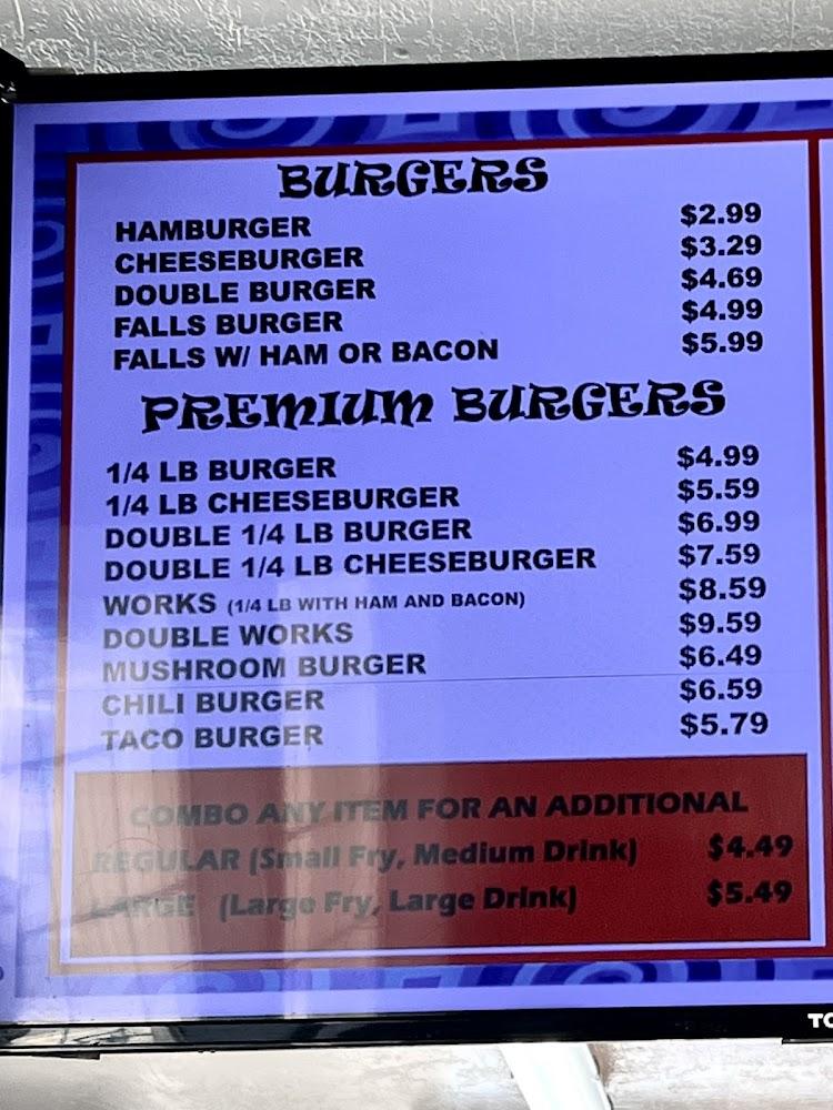 Falls Grill offers a diverse menu for fast food lovers. Burger options range from classic cheeseburgers to premium selections like the 1/4 lb Cheeseburger. Chicken baskets and fish options bring variety. Tasty sides include crispy onion rings and golden tater tots. For sweet tooths, milkshakes in various flavors offer a treat. The kid’s menu ensures younger diners have their favorites too. With a total of 77 items, Falls Grill has something for everyone, satisfying cravings without straining budgets.
